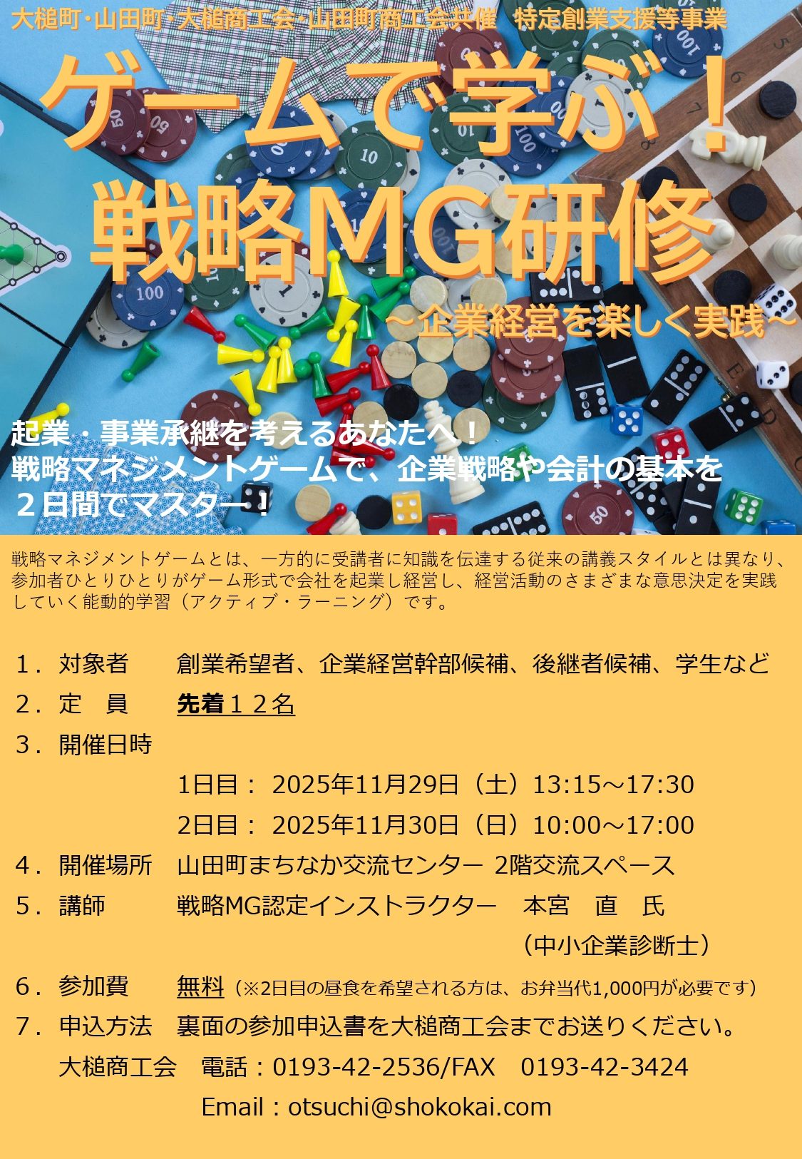 大槌商工会では、山田町商工会と共同で「ゲームで学ぶ!戦略MG研修 ~企業経営を楽しく実践~」を開催します。