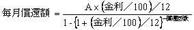 既往住宅債務 ※ 右欄のうち、(1)又は(2)により算出 | (1) 既往住宅債務の最終償還日までの償還予定表がある場合は、既往住宅債務の償還予定表に記載された新住宅債務の金銭消費貸借契約日の属する月から5年又は60回(60回に満たない場合は最終回。)のうちいずれか早いものの支払予定利子額の合計額(1,000円未満の端数切捨て)を一括して補助する。 (2) 既往住宅債務の最終償還日までの償還予定表がない場合は、新住宅債務の金銭消費貸借契約日の前月末日の既往住宅債務の融資残高(以下「A」とする。)を次のアからエの条件により償還した場合の第1回から第60回(60回に満たない場合は最終回。)までの利子額(1,000円未満の端数を切捨て)を一括して補助する。 ア 償還方法 元利均等毎月償還 イ 金利 基準日現在の既往住宅債務の金利 ウ 償還回数 新住宅債務に係る金銭消費貸借契約日の属する月から既往住宅債務の最終償還日の属する月までの月数 エ 毎月償還額及び利子額の計算方法 (ア) 画像 [画像] (イ) 利子額=(毎月の償還日直前の融資残高)×(金利/100)/12 (3) 利子補給額は、対象者が上記新築又は補修により借り入れた額を超えないものとする。 |